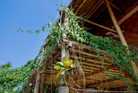 走进喊沙村,金色的寨门伫立村口,村子道路两旁建盖的座座竹楼别具一格,平整的道路尽情地延伸向村子深处。文化广场中央一座独具佛教文化色彩、美观大方的雕塑矗立,四周被竹楼所包围,摇曳的凤尾竹和婆娑的榕树群争芳斗艳。佛教文化与民族文化相得益彰。